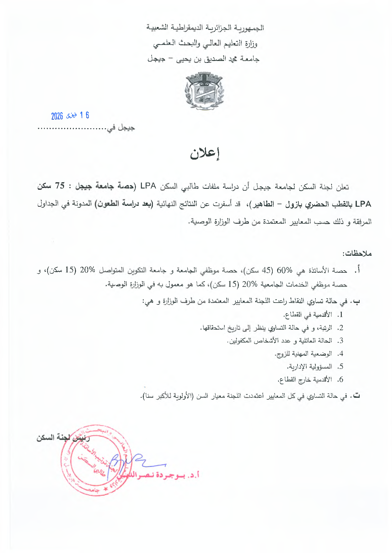تعلن لجنة السكن لجامعة جيجل أن دراسة ملفات طالبي السكن LPA ( حصة جامعة جيجل : 75 سكن LPA بالقطب الحضري بازول ) قد أسفرت عن النتائج النهائية ( بعد دراسة الطعون ) في الجداول المرفقة و ذلك حسب المعايير المعتمدة من طرف الوزارة الوصية.